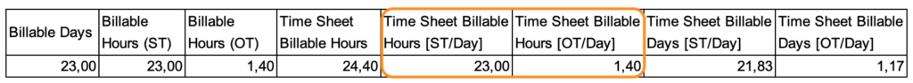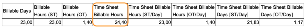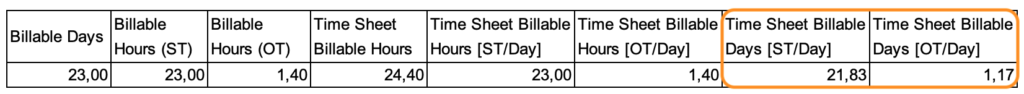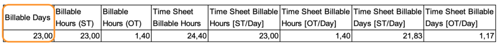You might expect this field to behave just like Time Sheet Billable Hours, but there’s a catch. While it does report billable days based on selected rate categories, it proportionally distributes the working days rather than simply counting them.