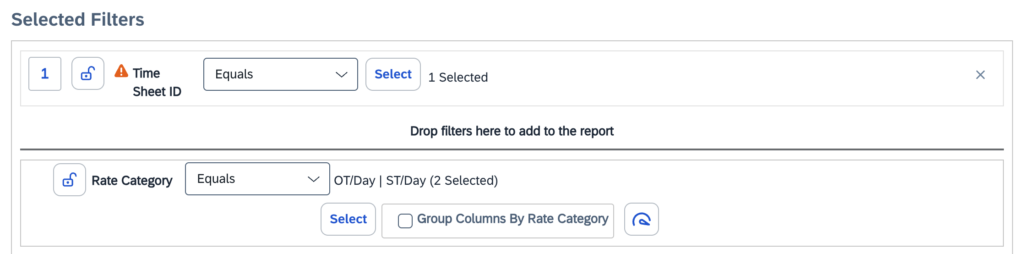 When adding this field to a report, the system automatically applies a “Rate Category” filter, requiring you to select the categories you want to report on.